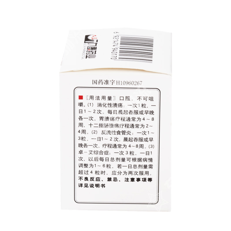 | 用法用量: | 口服,不可咀嚼。⑴消化性溃疡:一次20mg(一次1粒),一日1~2次。每日晨起吞服或早晚各一次,胃溃疡疗程通常为4~8周,十二指肠溃疡疗程通常2~4周;⑵反流性食管炎:一次20~60mg(一次1~3粒),一日1~2次。晨起吞服或早晚各一次,疗程通常为4~8周;⑶卓-艾综合症:一次60mg(一次3粒),一日1次,以后每日总剂量可根据病情调整为20~120mg(1~6粒),若一日总剂量需超过80mg(4粒)时,应分为两次服用。 |