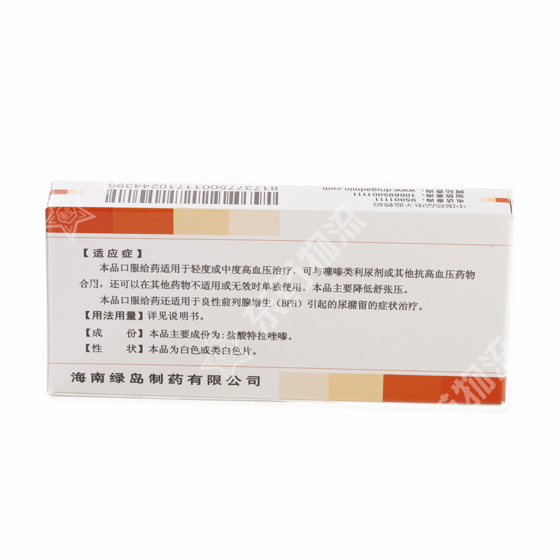 | 功能主治: | 本品功效:1. 用于治疗高血压,可单独使用或与其它抗高血压药同时使用。2. 用于治疗良性前列腺增生症患者的排尿症状,如:尿频、尿急、尿线变细、排尿困难、夜尿增多、排尿不尽感等。 |