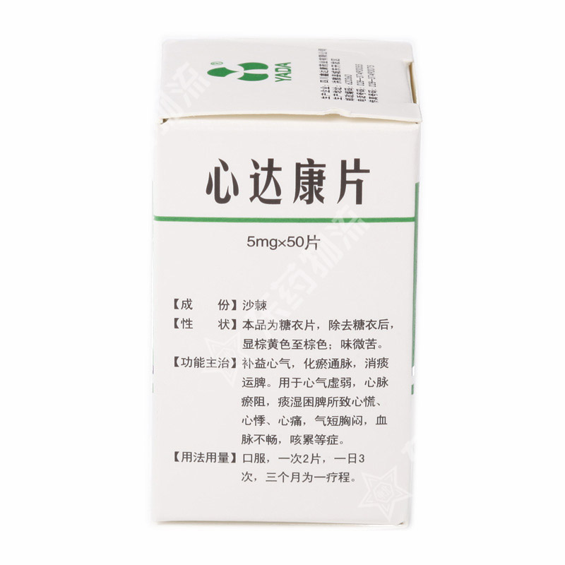 功能主治: 心达康片的功能与主治是补益心气,化瘀通脉,消痰运脾。用于心气虚弱,心脉瘀阻,痰湿困脾所致心慌、心悸、心痛,气短胸闷,血脉不畅,咳累等症。预防治疗冠心病、心绞痛,具有心肌保护作用。