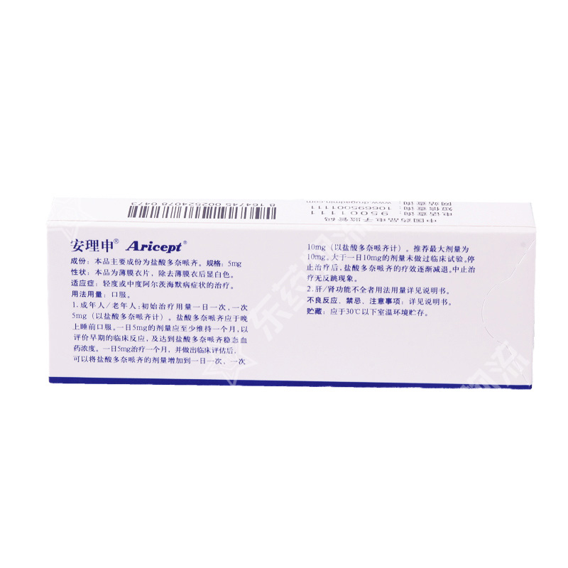 | 用法用量: | 口服。初始用量每次5mg(1片),每日一次,睡前服用;并至少将初始剂量维持1个月以上,才可根据治疗效果增加剂量至每次10mg(2片),仍每日一次。最大推荐剂量为每日10mg。大于每日10mg的剂量未进行过临床研究。停止治疗后,盐酸多奈哌齐的疗效逐渐减退,中止治疗无反跳现象。对于肾功能不全及轻至中度肝功能不全者,盐酸多奈哌齐的消除不受影响,因此这些病人可使用相似剂量方案。或遵医嘱。 |