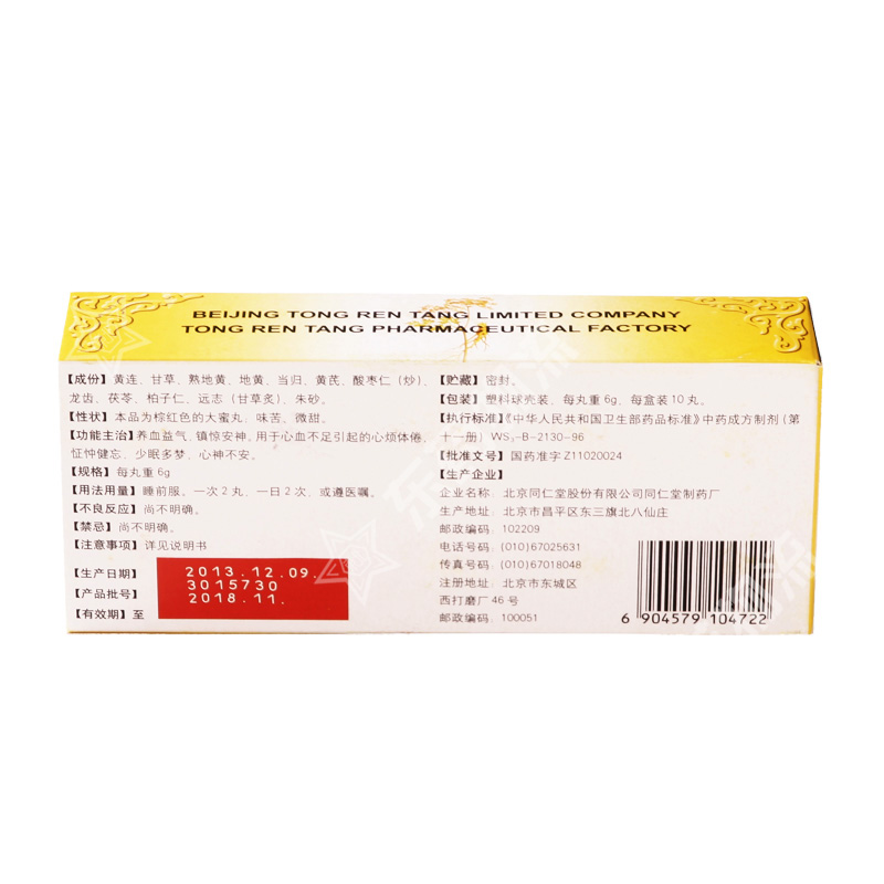 | 成份: | 黄连、甘草、熟地黄、地黄、当归、黄芪、酸枣仁(炒)、龙齿、茯苓、柏子仁、远志(甘草炙)、朱砂。 |