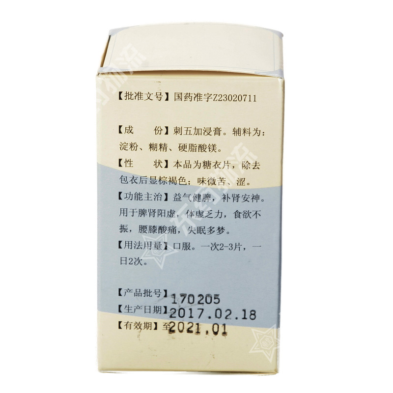 | 成份: | 刺五加浸膏。辅料为:淀粉、糊精、硬脂酸镁。 |