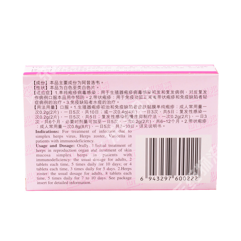 功能主治: ​1.单纯疱疹病毒感染:用于生殖器疱疹病毒感染初发和复发病例,对反复发作病例口服本品用作预防。2.带状疱疹:用于免疫功能正常者带状疱疹和免疫缺陷者轻症病例的治疗。 3.免疫缺陷者水痘的治疗。