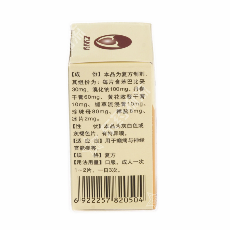 | 成份: | 本品为复方制剂,其组份为:每片含苯巴比妥30mg、溴化钠100mg、丹参60mg、黄花败酱暂无内容,点击创建10mg、缬草10mg、珍珠母80mg、樟脑8mg、冰片2mg。 |
