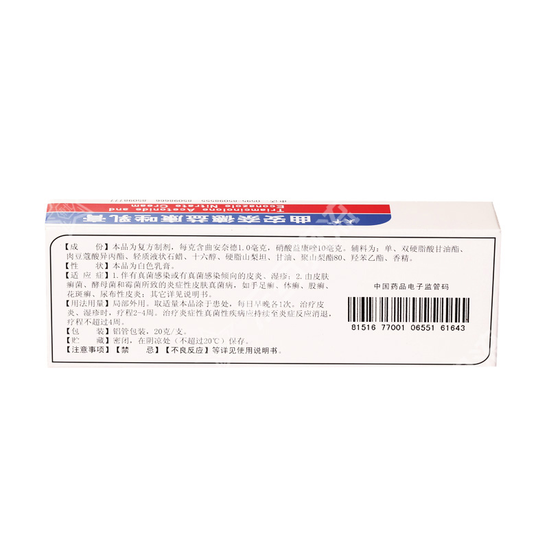 | 成份: | 本品为复方制剂,每克含硝酸益康唑10毫克、曲安奈德1.0毫克。 |