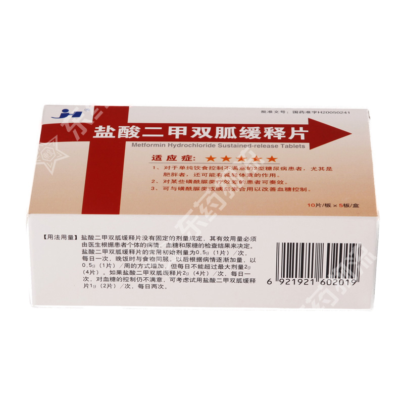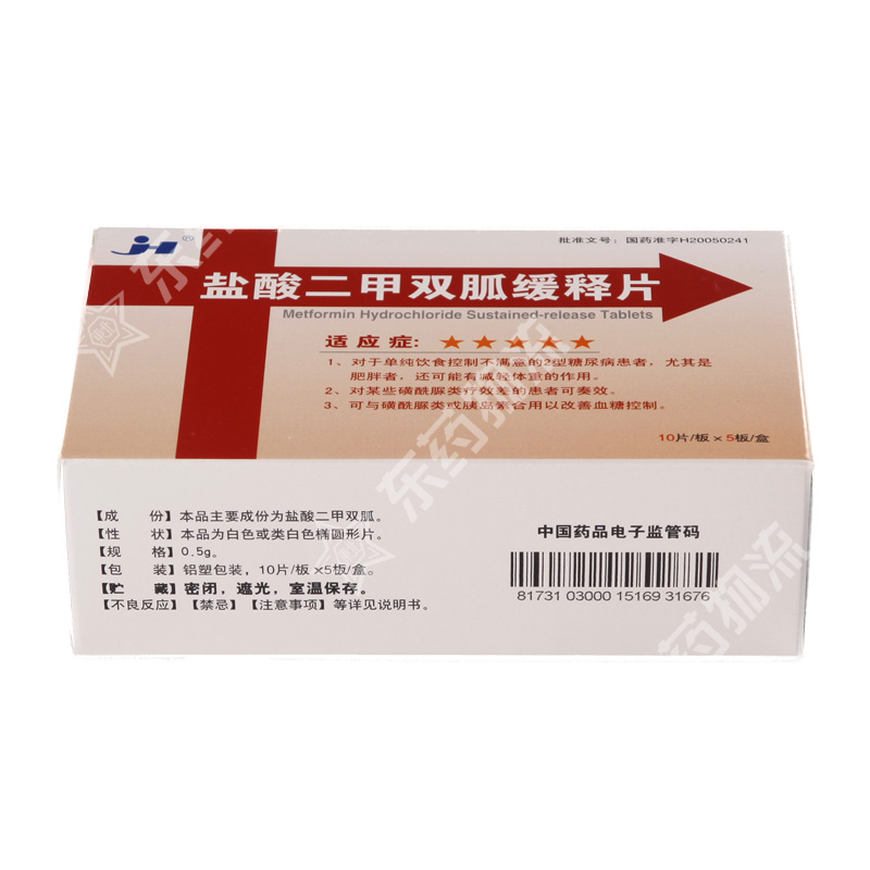 | 注意事项: | 1.在使用二甲双胍的病人中,由于二甲双胍的累积有可能发生乳酸性酸中毒,这是一种罕见而严重的代谢性并发症,一旦发生,则会导致生命危险,因此对服用本品的患者,应进行肾功能监测和给药以最低有效用量为标准,从而来显著降低乳酸性酸中毒的发生风险。2.本品禁止嚼碎口服,应整片吞服,并在进食时或餐后服用。 3.当患者需要进行放射性研究而使用静脉注射碘化造影剂时,患者应暂时停止服用本品,因为这可能导致急性肾功能改变。 4.本品与磺酰脲类药物合用时,可引起低血糖、应监测患者血糖情况。 5.本品与胰岛素合用会增强降血糖作用,故应调整剂量。 6.应定期监测血糖、糖化血红蛋白、尿糖、尿酮体情况。 7.部分病人发现在临床无症状的情况下,维生素B12的水平低于正常值,这可能是由于二甲双胍干扰了维生素B12的吸收,这可能导致贫血,虽然可能性很小,但仍建议监测血象,患者至少每年检查一次血液参数。 8.本品与乙醇同服时会增强盐酸二甲双胍对乳酸代谢的影响,易导致乳酸性酸中毒发生,因此,服用本品时应尽量避免饮酒。 9.发生皮疹等过敏反应者应停止使用本品。 |