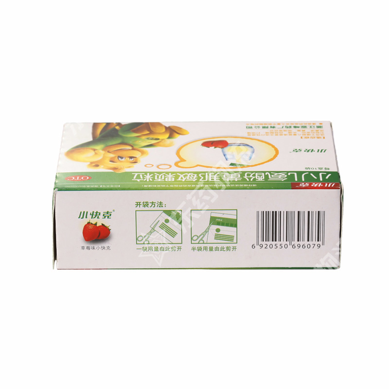 | 成份: | 本品为复方制剂,每袋含对乙酰氨基酚125毫克,马来酸氯苯那敏0.5毫克,人工牛黄5毫克,辅料为:蔗糖、草莓香精、聚维酮K30。 |