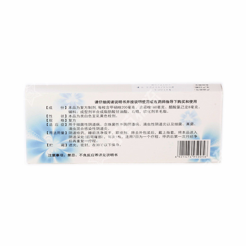 成份: 本品为复方制剂,每枚含主要成份甲硝唑200毫克 、克霉唑160毫克、醋酸氯己定8毫克。辅料为:成型剂半合成脂肪酸甘油酯、石蜡,软化剂羊毛脂。​