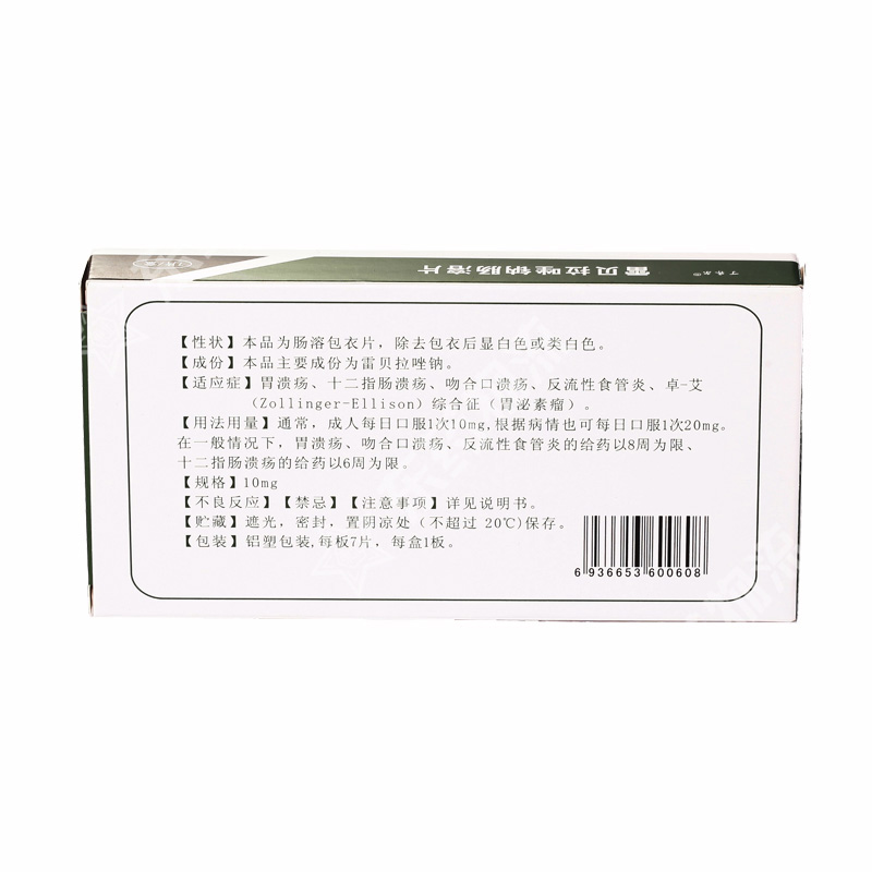 | 用法用量: | 本品不能咀嚼或压碎服用,应整粒吞服。1、成年人/老年患者的用药。 A、活动性十二指肠溃疡和活动性良性胃溃疡患者:20mg(2片),一日1次,晨服。大多数活动性十二指肠溃疡患者在用药4周后痊愈。但有2%的患者还需要继续用药4周才能痊愈。一些十二指肠溃疡患者10mg(1片)片剂,一日1次的治疗量即有反应。大多数活动性良性胃溃疡需在用药6周后痊愈。但有9%的患者还需继续用药六周才可达痊愈。 B、侵蚀性或溃疡性的胃-食管返流征(GERD)患者:20mg(2片),一日1次, 疗程为4-8周。 C、胃-食管返流征的长期治疗方案(GERD)的维持治疗:疗程为12个月,维持治疗量为10mg(1片)或20mg(2片),一日1次。一些患者对10mg(1片)/日的维持治疗量即有反应。 D、幽门螺旋杆菌的根治性治疗:与适当的抗生素合用,可用根治幽门螺旋杆菌阳性的十二指肠溃疡。本品应在早晨、餐前服用,尽管用药时间及摄食对雷贝拉唑钠药效无影响,但此种给药方式更有利于治疗的进行。 2. 肝肾功能不全患者的用药。肝肾功能不全患者在用药过程中无需进行剂量调节。但在对有严重的肝功能不全患者用药时 应参见“不良反应及注意事项”。 |