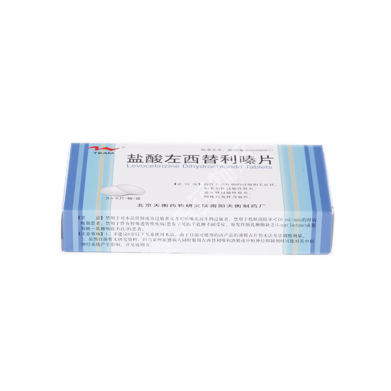 | 注意事项: | 1. 不建议6岁以下儿童使用本品,由于目前可使用的该产品的薄膜衣片仍无法允许调整剂量。2. 虽然目前暂无研究资料,但当某些敏感病人同时服用左西替利嗪和酒精或中枢神经抑制剂时可能对其中枢神经系统产生影响。3. 对驾驶和操作机械能力的影响:对照临床试验证实,左西替利嗪在推荐剂量下不会削弱病人的警戒性、反应和驾驶的能力。如果患者需要驾驶、从事有潜在危险的活动或操作机械时,切勿过量服用并考虑其本品的反应;合并服用酒精或其他中枢神经系统抑制剂可能导致其警戒性降低和操作能力削弱。 |