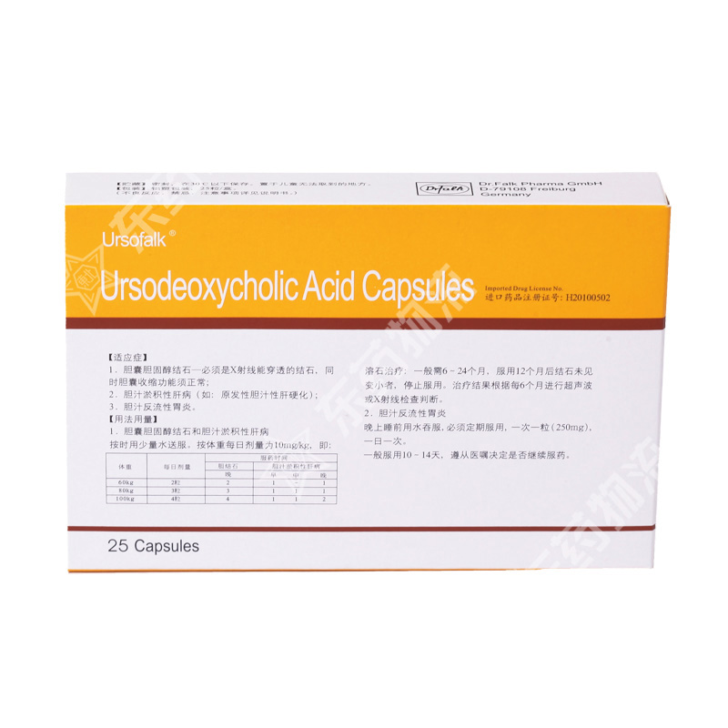 | 用法用量: | 胆固醇性胆结石10mg/kg体重/日。结石必须是X射线能穿透的,同时胆囊收缩功能须正常。原发性胆汁淤积性肝硬变,原发性硬化性胆管炎15mg/kg体重/日。胆汁返流性胃炎250mg/日,睡前服。 |