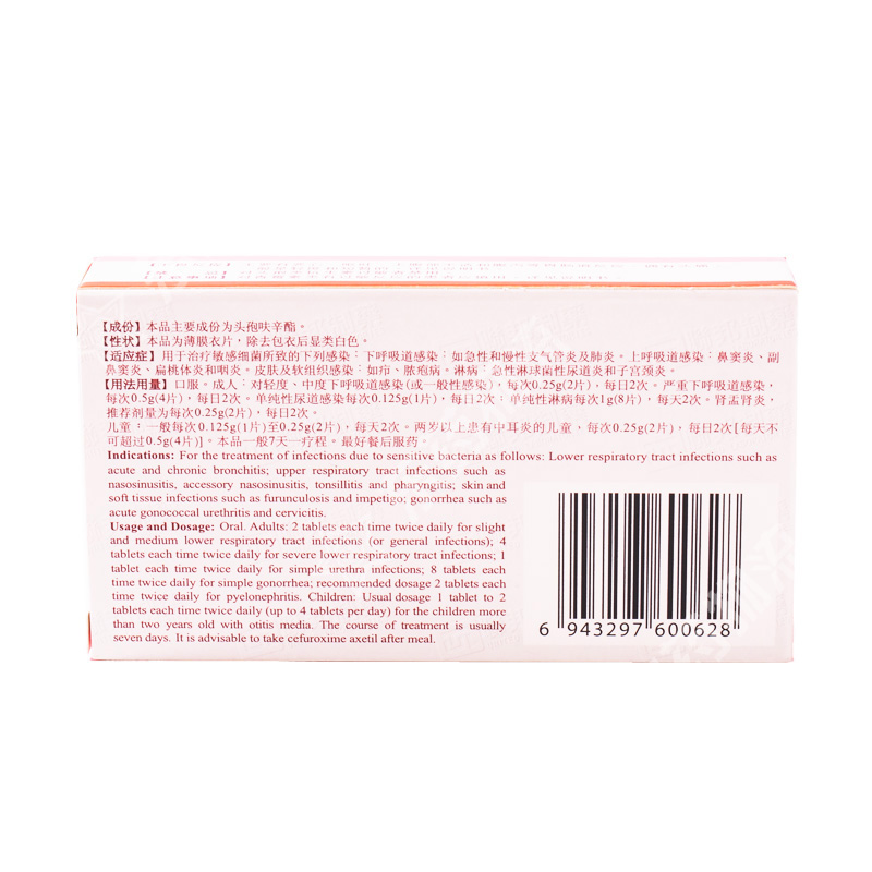 | 成份: | 本品主要成分为头孢呋辛酯,其化学名为(6R,7R)-7-[2-呋喃基(甲氧亚氨基)乙酰氨基]-3-氨基甲酰氧甲基-8-氧代-5-硫杂-1-氮杂双环[4.2.0]辛-2-烯-2-羧酸,1-乙酰氧基乙酯。 |