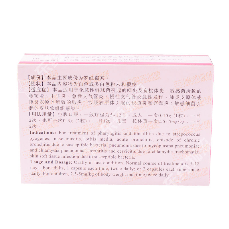 | 禁忌: | 对本品、红霉素或其他大环内酯类药物过敏者禁用。 |