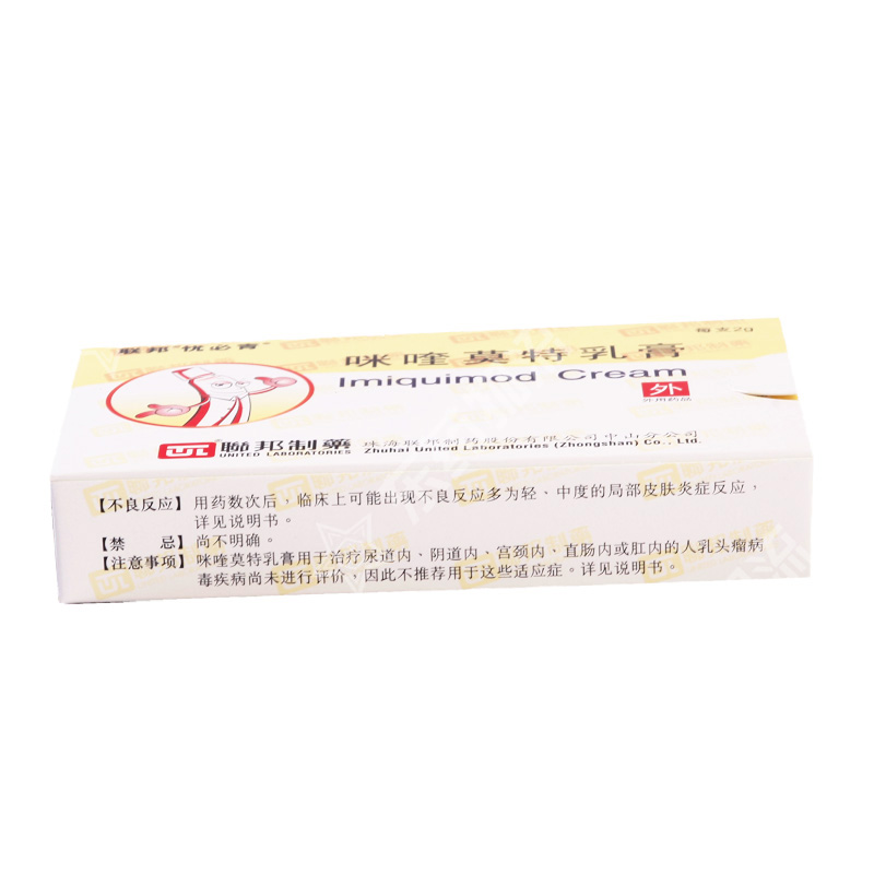 | 禁忌: | 1 对咪喹莫特或赋形剂过敏者; 2 不推荐用于尿道、阴道内、子宫颈、直肠或肛门内的HPV感染; 3 不推荐在其它药物或外科治疗后立即使用5%咪喹莫特乳膏剂治疗;也不推荐5%咪喹莫特乳膏剂与其它治疗外生殖器疣的药配伍使用。 |