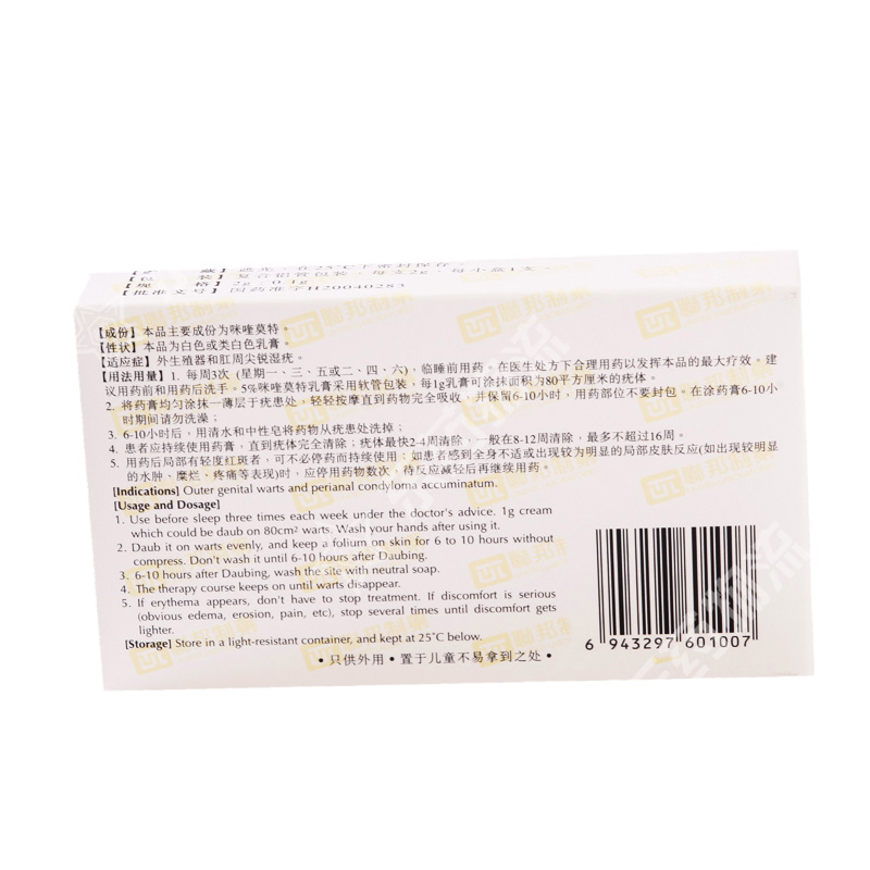 | 药代动力学: | 6名健康受试者单次局部给予5mg[14C]标记的咪喹莫特乳膏研究表明,[14C]标记的咪喹莫特经皮再吸收很少。局部应用咪喹莫特,在血清中没有检测到放射活性物(最低检出限:1mg/ml),尿和粪便中的放射活性物小于放射标记量的0.9%。 |