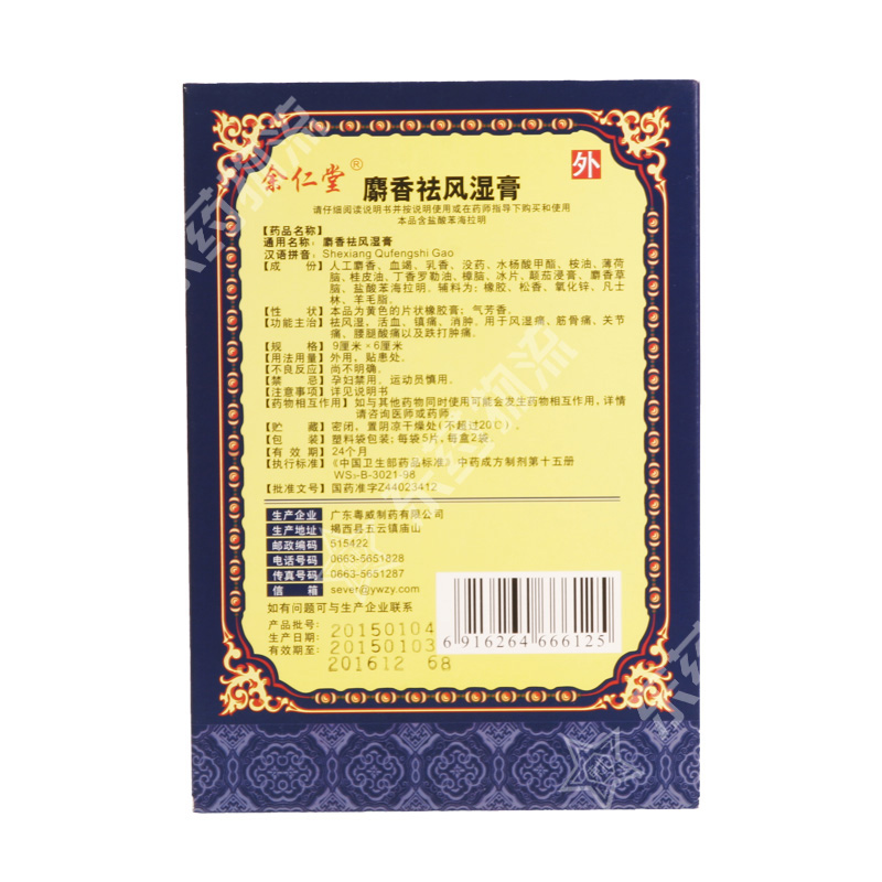 | 成份: | 人工麝香、血竭、乳香、没药、水杨酸甲酯、桉油、薄荷脑、桂皮油、丁香罗勒油、樟脑、冰片、颠茄浸膏、麝香草脑、盐酸苯海拉明。辅料为:橡胶、松香、氧化锌、凡士林、羊毛脂。 |