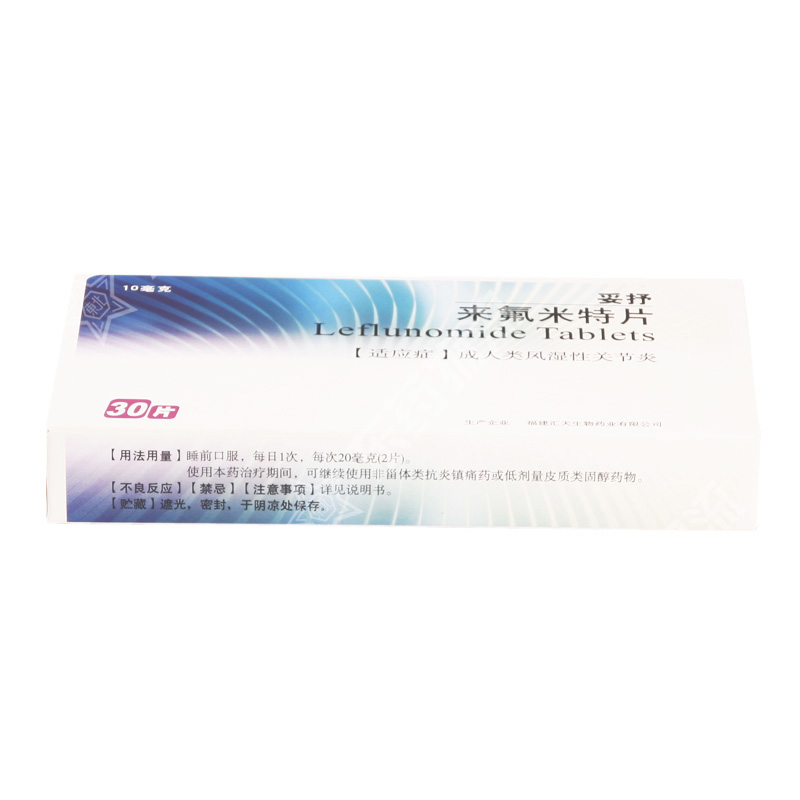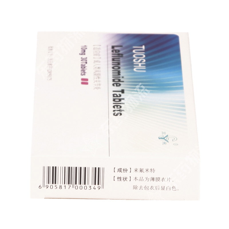 | 注意事项: | 1. 严重免疫缺陷病人,骨髓发育不良者,乙型或丙型肝炎患者,严重或无法控制感染患者和活疫苗免疫时不宜使用本品。2. 准备生育的男性应考虑停止治疗,同时服用消胆胺或活性炭。3. 如来氟米特使用过程中,出现罕见不良反应,如骨髓抑制,斯-约二氏综合症,毒性表皮坏死,停止服用来氟米特,同时服用消胆胺或活性炭,降低血浆中M1水平。4. 来氟米特使用过程中,可出现一过性丙氨酸氨基转移酶(ALT)升高,故服用初期,应每月检测一次ALT。如ALT升高在正常值2倍以内(<80U/L),继续观察;如ALT升高在正常值2倍~3倍(80~120U/L),减半量服用,继续观察,若ALT继续升高或仍然维持在80~120U/L,应中断治疗;如ALT大于正常值3倍以上(>120U/L),应停药,且进行消胆胺或活性炭治疗。停药后,ALT恢复正常,可继续用药,同时加强护肝治疗及随访,多数病人不会出现ALT再次升高。5. 服用期间出现白细胞下降,如白细胞>3×109/L,继续服用观察。(1) 如白细胞在2×109/L~3×109/L之间,减半观察,继续用药期间,多数病人可恢复正常,若复查白细胞仍低于3×109/L,则中断治疗。(2) 如白细胞<2×109/L,中断治疗。6. 如患者有血液异常病史或肾功能和肝功能不全患者,使用本品时应慎重,经常进行血液和临床检测。7. 如果剂量过大或出现毒性时,可给予消胆胺或活性炭加以消除。8. 具体方法:口服消胆胺3次/日,每次8克,连续服用11天,1天M1血浆浓度降低约40%,2天降低约49%~65%,11天降低约0.02ug/ml。或者通过胃管或口服给予活性炭(混悬液),每6小时50克,1天M1血浆浓度降低约37%,2天降低约48%。 |