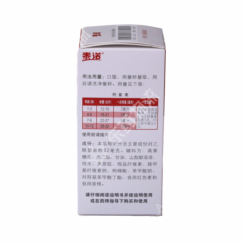 | 用法用量: | 口服,用滴管量取,用量如下 :1. 1-3岁儿童 (12-15 kg) 3 mL/次。 2. 4-6岁儿童 (16-21 kg) 5 mL/次。 3. 7-9岁儿童 (22-27 kg) 8 mL/次。 4. 10-12岁幼儿 (28-32 kg) 10 mL/次。 若持续高热或疼痛,可间隔4-6小时重复用药1次,24小时内不超过4次。 |