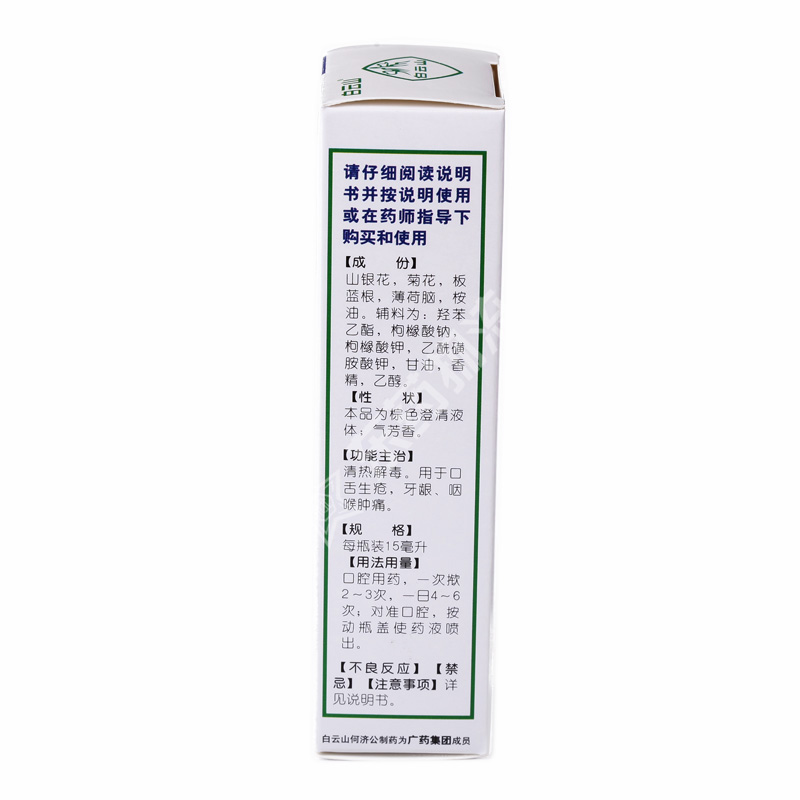 | 成份: | 山银花,菊花,板蓝根,薄荷脑,桉油。辅料为:羟苯乙酯,枸橼酸钠,枸橼酸钾,乙酰磺胺酸钾,甘油,香精,乙醇。 |