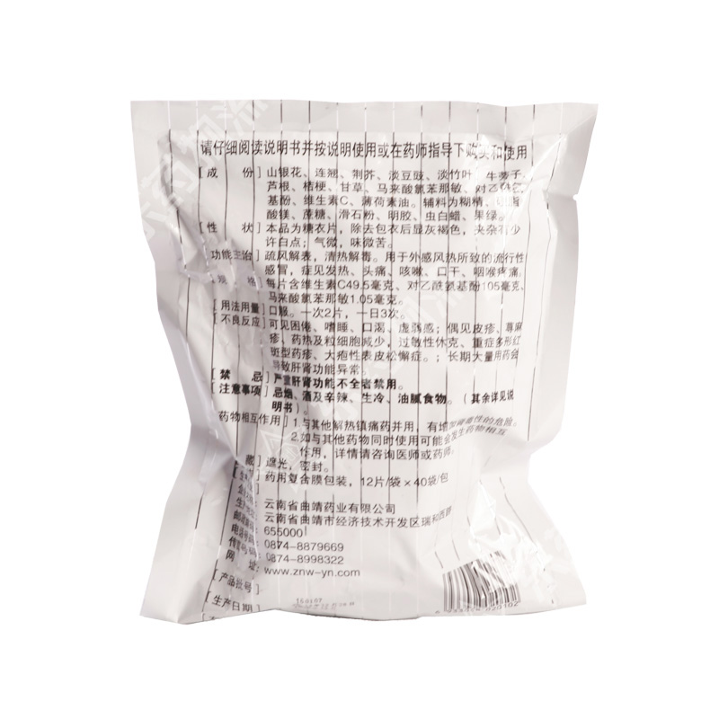 | 成份: | 金银花、连翘、荆芥、淡豆豉、淡竹叶、牛蒡子、芦根、桔梗、甘草、马来酸氯苯那敏、对乙酰氨基酚、维生素C、薄荷油。辅料为淀粉、倍他环糊精、硬脂酸镁、蔗糖、滑石粉、明胶、柠檬黄、亮蓝、虫白蜡。 |