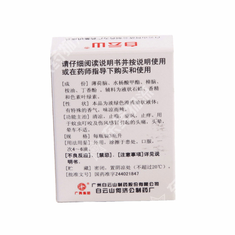| 功能主治: | 消炎、镇痛,清凉、止痒,驱风。用于伤风感冒引起的头痛、头 晕以及由关节痛、牙痛、腹部胀痛和蚊虫叮咬、晕车等引起的不适。 |