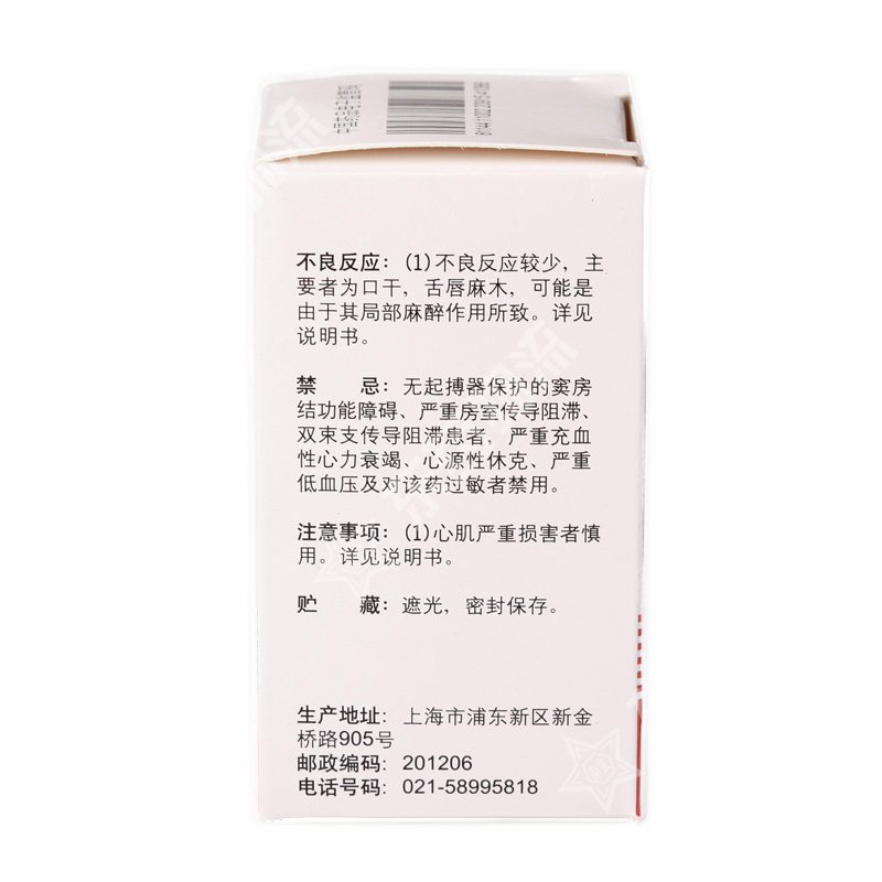 | 不良反应: | 1 不良反应较少,主要者为口干,舌唇麻木,可能是由于其局部麻醉作用所致。此外,早期的不良反应还有头痛,头晕、闪耀,其后可出现胃肠道障碍如恶心、呕吐、便秘等。也有出现房室阻断症状。有两例在连续服用两周后出现胆汁郁积性肝损伤的报道,停药后2~4周各酶的活性均恢复正常。据认为这一病理变化属于过敏反应及个体因素性。2 在试用过程中未见肺、肝及造血系统的损害,有少数病人出现上述口干、头痛、眩晕、胃肠道不适等轻微反应,一般都在停药后或减量后症状消失。有报道个别病人出现房室传导阻滞,Q-T间期延长,P-R间期轻度延长 |