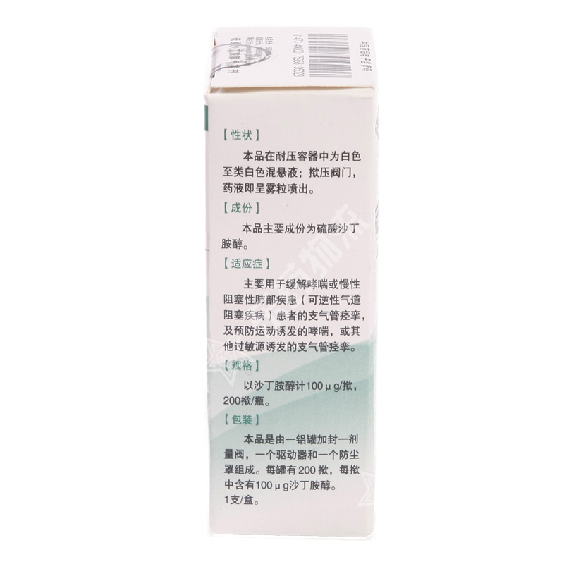 | 用法用量: | 本品只能经口腔吸入使用,对吸气与吸药同步进行有困难的患者可借助储雾器。成人: 缓解哮喘急性发作,包括支气管痉挛:以1揿100微克作为最小起始剂量,如有必要可增至2揿。 用于预防过敏原或运动引发的症状:运动前或接触过敏原前10-15分钟给药。对于长期治疗,最大剂量为每日给药4次,每次2揿。 老年人用药: 老年患者的起始用药剂量应低于推荐的成年患者用量。如果没有达到充分的支气管扩张作用,应逐渐增加剂量。 儿童: 用于缓解哮喘急性发作,包括支气管痉挛或在接触过敏原之前及运动前给药的推荐剂量为1揿,如有必要可增至2揿。 长期治疗一最大剂量为每日给药4次,每次2揿。 本品可借助英立畅(Babyhaler)对5岁以下婴、幼儿给药。 肝功能损害患者: 约60%的口服沙丁胺醇代谢成无活性形式(不仅包括片剂和糖浆,同时也包括约90%的吸入剂量),肝功能的损害可造成原形沙丁胺醇的蓄积。 肾功能损害患者: 约60 - 70%吸入药量或静脉注射的沙丁胺醇经尿液以原型排出。肾功能损害的患者需减少剂量以防止过度或延长的药物作用。 随需要而使用本品,任一24小时内的用药量不得超过8揿。若需增加给药频率或突然增加用药量才能缓解症状,表明患者病情恶化或对哮喘控制不当。过量的药物会导致不良反应,因此,只有在医生的指导下,才可增加剂量或用药次数。 (参见【注意事项】)。 |