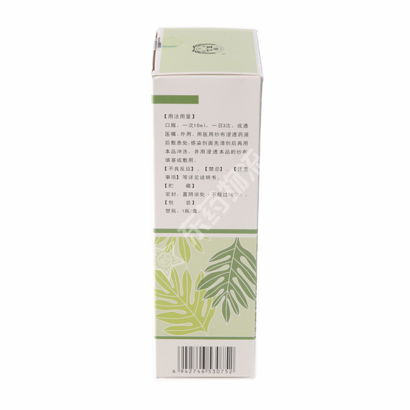 | 用法用量: | 口服,一次10m,l一日3次,或遵医嘱。外用,用医用纱 布浸透药液后敷患处,感染创面先清创后再用本品冲 洗,并用浸透本品的纱布填塞或敷用。 |