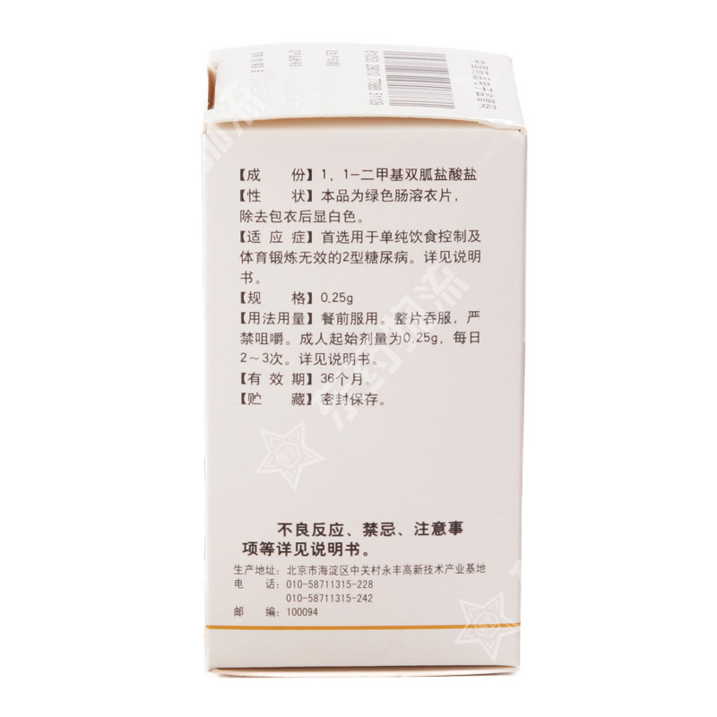 | 药理作用: | 盐酸二甲双胍是一种降血糖药,具有提高2型糖尿病患者的血糖耐受性,降低基础和餐后血糖的作用。盐酸二甲双胍的作用机理不同于其它类型的口服降血糖药,它可减少肝糖的产生,降低肠对糖的吸收,并且可通过增加外周糖的摄取和利用而提高胰岛素的敏感性,与磺酰脲类药物不同的是,盐酸二甲双胍不会对2型糖尿病患者或者正常血糖患者产生低血糖症(除特殊情况-见注意事项)。盐酸二甲双胍治疗后,胰岛素的分泌保持不变,而降低空腹胰岛素水平及每日血浆胰岛素水平。毒理研究 遗传毒性: 本品Ames试验、小鼠淋巴细胞基因突变试验、人淋巴细胞染色体畸变试验和小鼠微核试验结果均为阴性。 生殖毒性: 雄性大鼠和雌性大鼠给予盐酸二甲双胍,剂量高达600mg/kg/日(按体表面积折算相当于人临床推荐最大日剂量的3倍),未见对生育能力的影响。大鼠和兔子给予盐酸二甲双胍,剂量高达600mg/kg/日(按体表面积折算相当于人临床推荐最大日剂量的2倍和6倍)时,无致畸胎作用。哺乳期大鼠的研究结果显示,盐酸二甲双胍可分泌入乳汁,并可达到在血浆的水平。 致癌性: 大鼠给予盐酸二甲双胍900mg/kg/日104周和小鼠给予盐酸二甲双胍1500mg/kg/日91周(按体表面积折算相当于人临床推荐最大日剂量的4倍),在动物身上未见致癌作用,但在900mg/kg/日的雌性大鼠中,有良性间质子宫息肉发生的增加。 |