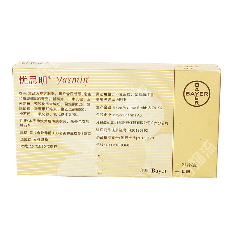 | 不良反应: | 在中国进行的Ⅲ期临床试验显示,整个临床试验中优思明组的570例患者中有163例(28.6%)出现与药物相关的不良事件,最常见的3个与治疗相关的不良事件(发生率超过或接近5%)为子宫不规则出血(36例即6.3%)、恶心(27例即4.7%)和情绪波动(32例即5.6%)。这些事件均为已知的复方口服避孕药的不良反应。试验中,优思明组患者发生的与试验药物肯定相关的严重不良事件是2例(0.4%)妊娠,这两名患者在发现妊娠以前均有漏服或者推迟服药的记录。服用优思明的患者中无其它严重不良反应发生。详细信息请见说明书。 |