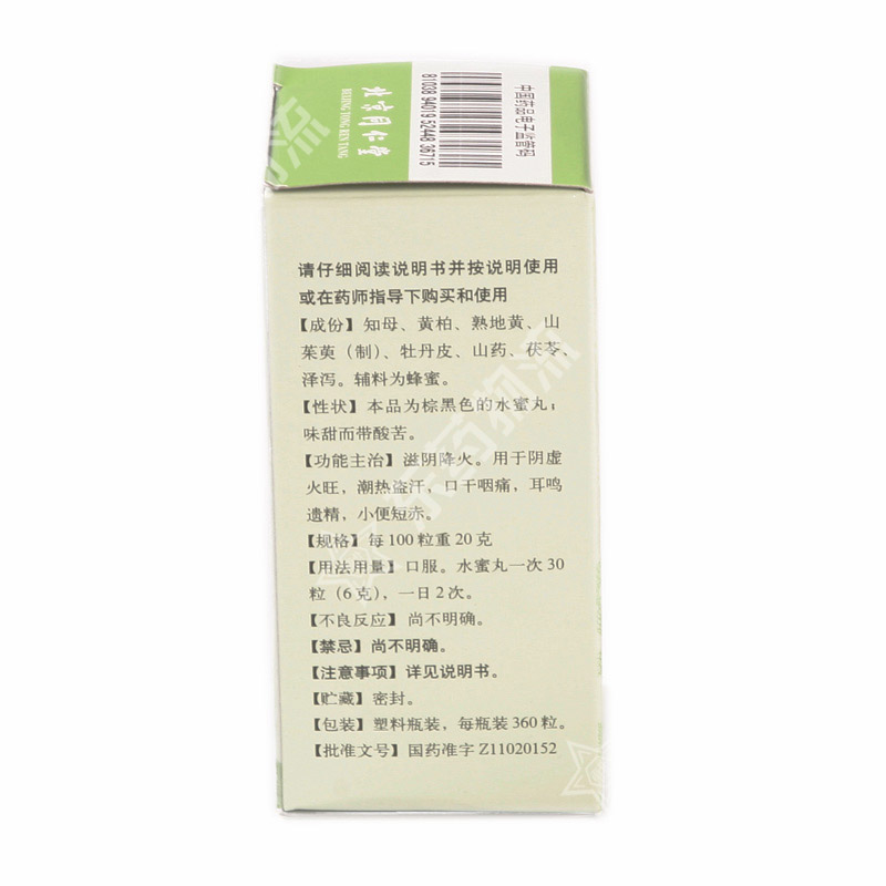 | 成份: | 主要成份为知母、黄柏、熟地黄、山药、山茱萸(制)、牡丹皮、茯苓、泽泻。辅料为蜂蜜。 |