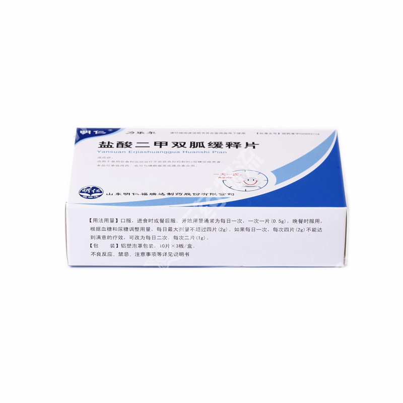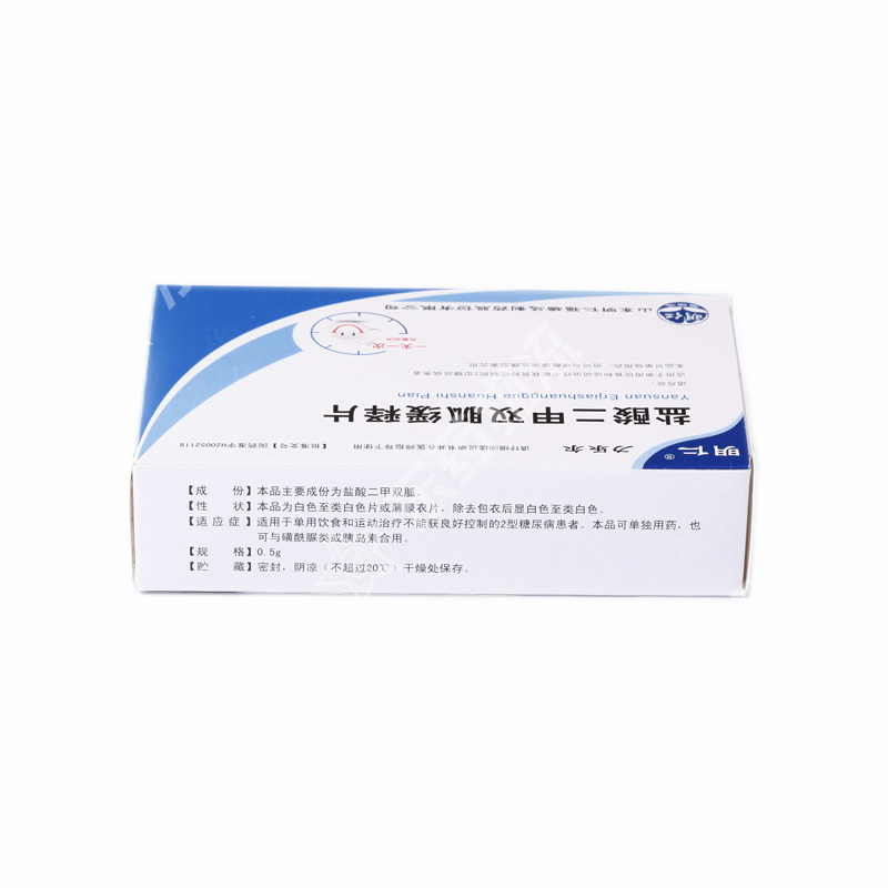 | 用法用量: | 口服,进食时或餐后服。开始用量通常为每日一次,一次一片(0.5g),晚餐时服用,根据血糖和尿糖调整用量,每日最大剂量不超过四片(2g)。如果每日一次,每次四片(2g)不能达到满意的疗效,可改为每日二次,每次二片(1g)。 |
