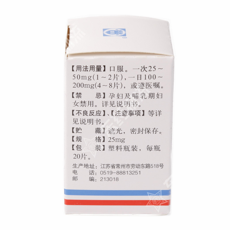 | 用法用量: | 口服。一次25~50mg(1~2片),一日100~200mg(4~8片),或遵医嘱。 |