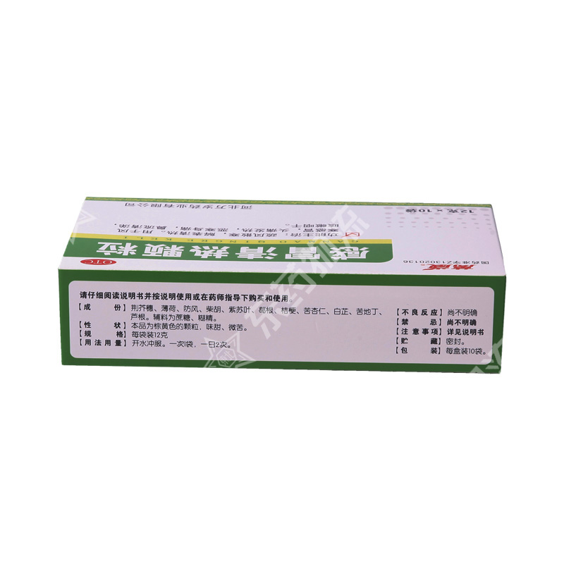 | 成份: | 荆芥穗、薄荷、防风、柴胡、紫苏叶、葛根、桔梗、苦杏仁、白芷、苦地丁、芦根。辅料为蔗糖、糊精。 |