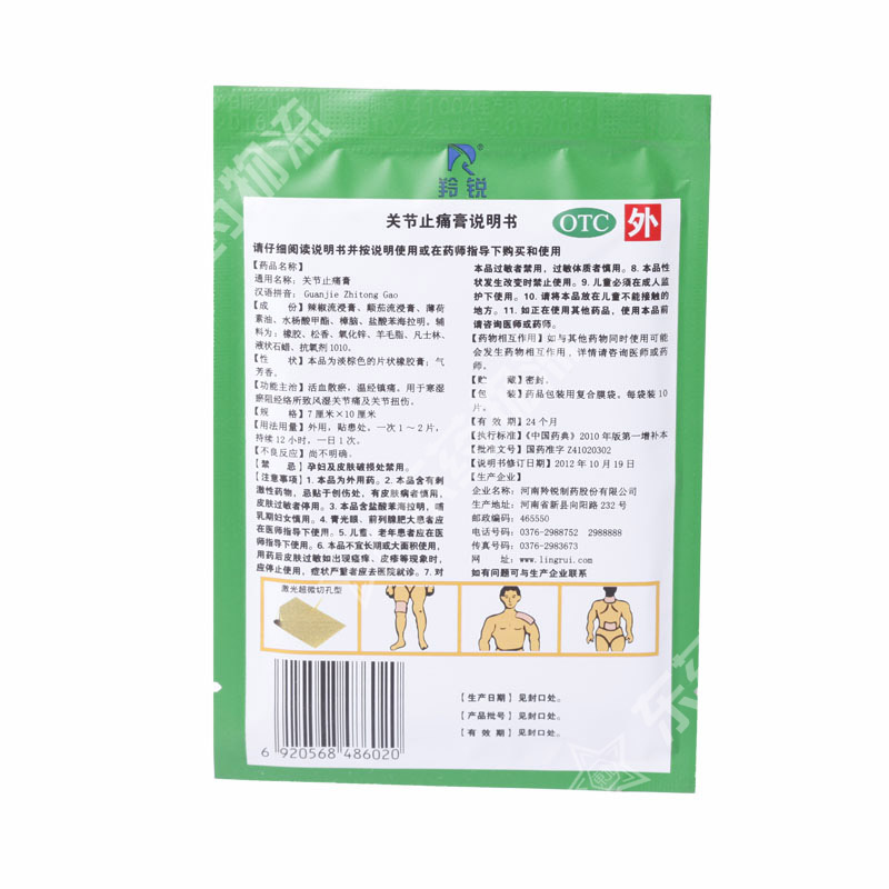 | 注意事项: | 1.本品为外用药,忌贴于创伤处。 2.忌生冷食物,避风寒。 3.孕妇及哺乳期妇女慎用。儿童、年老体弱者应在医师指导下使用。 4.本品为对症用药,如症状严重应去医院就诊。 5.若出现水泡则应停贴,必要时应去医院就诊,愈后酌情使用。 6.用药7天症状无缓解,应去医院就诊。 7.本品不宜长期或大面积使用。 8.对本品过敏者禁用,过敏体质者慎用。 9.药品性状发生改变时禁止使用。 10.儿童必须在成人监护下使用。 11.请将本品放在儿童不能接触的地方。 13.如正在使用其他药品,使用本品前请咨询医师或药师。 |