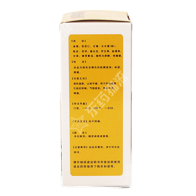 | 成份: | 麻黄、苦杏仁、石膏、水半夏(制)、陈皮、茯苓、桑白皮、罗汉果、鱼腥草、甘草、薄荷油。辅料为蔗糖、枸橼酸。 |