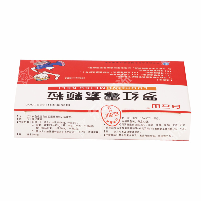 | 用法用量: | 口服: 1. 成人:一次150mg,一日2次。 2. 儿童:体重24~40kg儿童,一次100mg,一日2次;12~23kg儿童,一次50mg,一日2次。 3. 婴幼儿:按体重一次2.5~5mg/kg,一日2次,或遵医嘱。 |